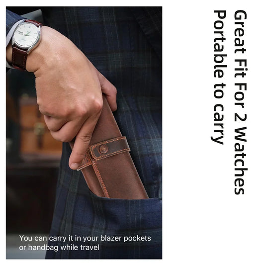 Full-Grain Oil Leather 2-Slot Watch Roll with Adjustable Case - Portable Travel Pouch with Metal Buckles and Microfiber Lining