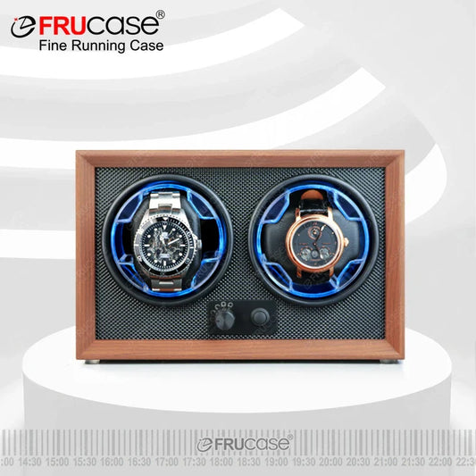 Double Watch Winder for Automatic Watches - Wood Grain Display Box with Light