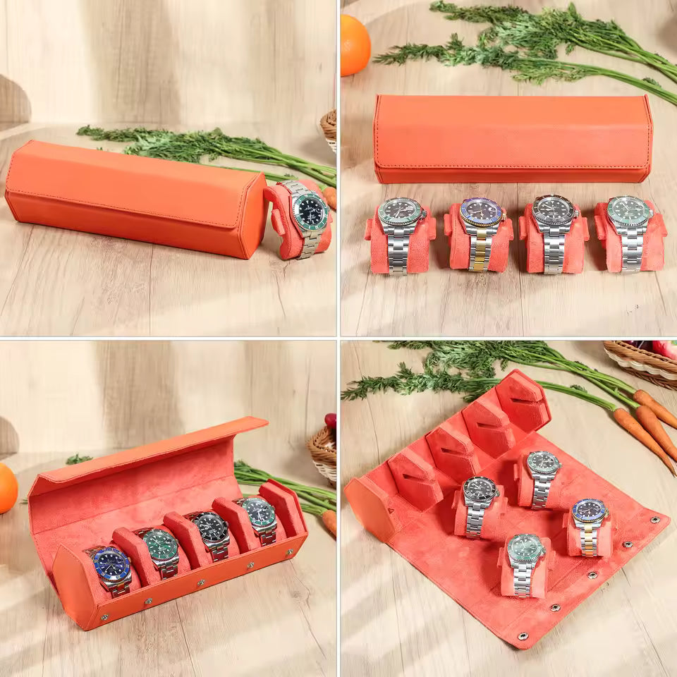 4-Slot Genuine Saffiano Leather Watch Roll Case - Portable Hexagon Watch Box Organizer