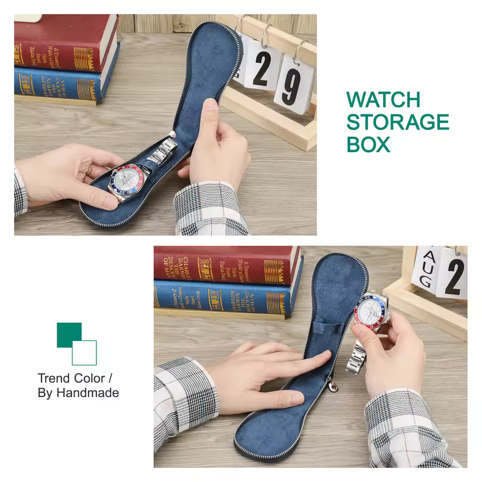 Genuine Saffiano Leather Single Slot Watch Case with Zipper - Portable Travel Watch Organizer